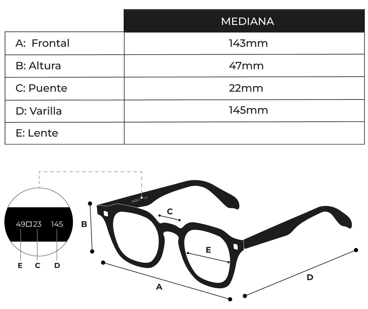 Si ya tienes unas gafas que te quedan bien, puedes comparar sus medidas con las que indicamos en esta página. Encontrarás tres números grabados en el interior de la varilla izquierda (por ejemplo: 46–23–145).